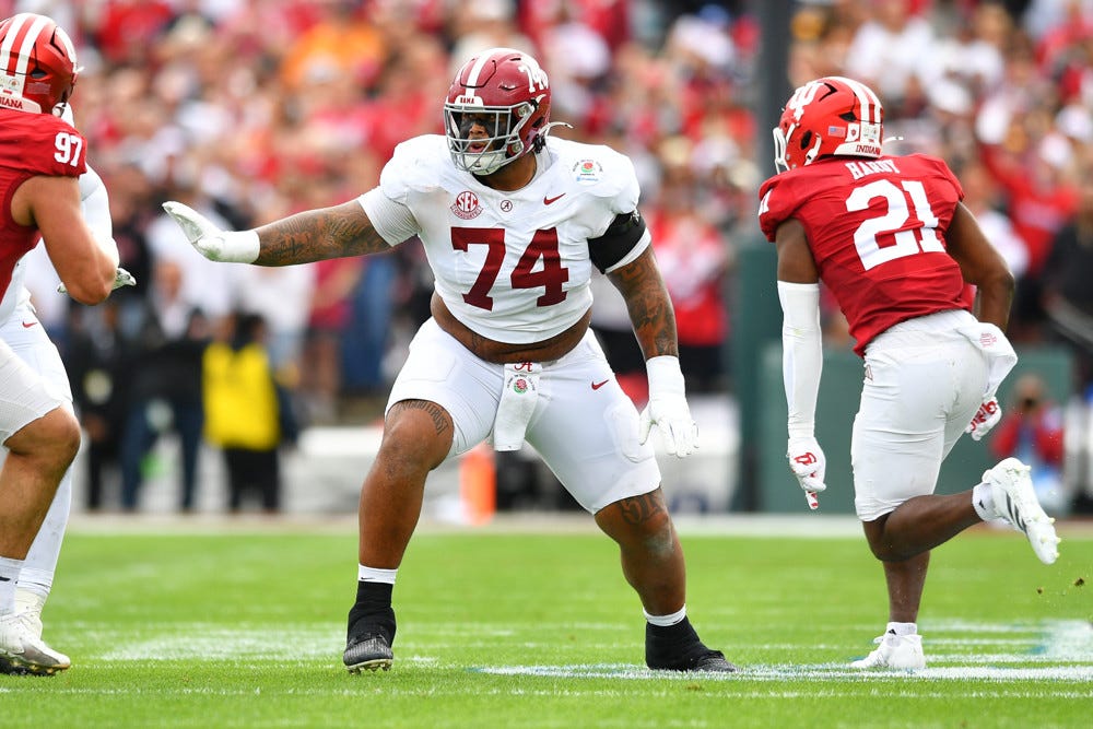 Prospect: Kadyn Proctor | Jersey #: 74 | Pro Pos.: OT/IOL | College Pos.: OT
