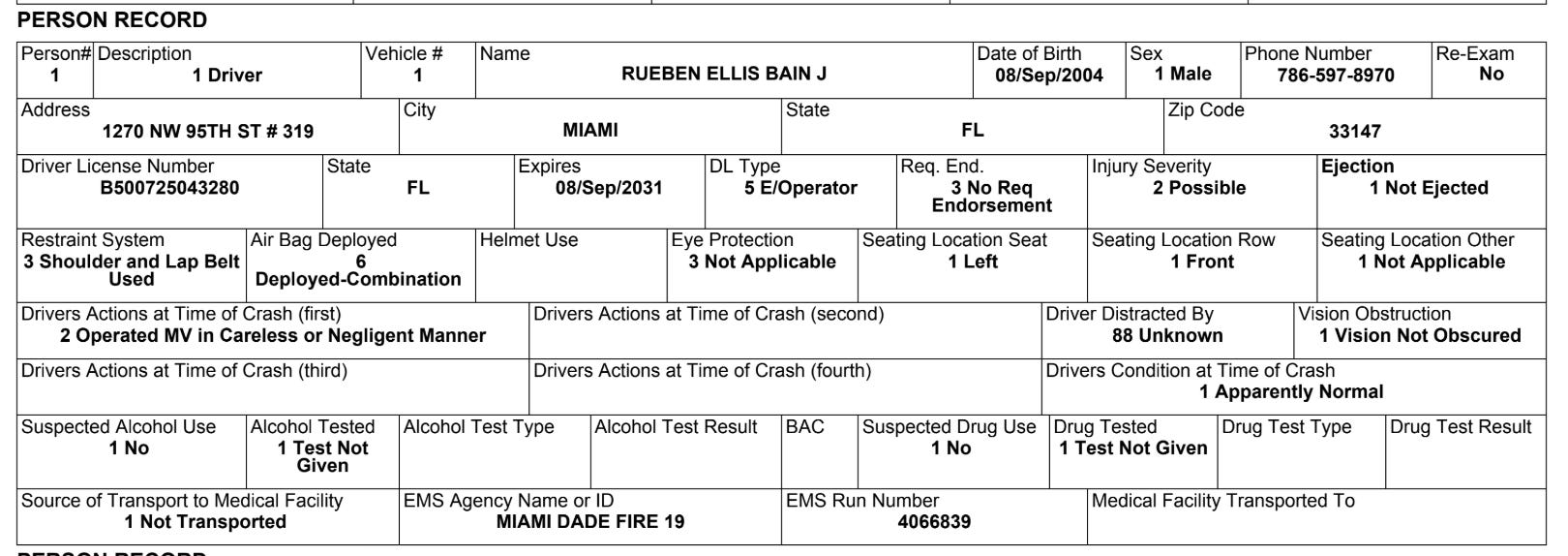 The police crash report states that Bain "operated his vehicle in a careless or negligent manner." Following the collision with the second vehicle, Bain's car — owned by a company named Miami Sports 27 Inc — struck the east concrete wall before being redirected into the west concrete wall, where it came to rest. It was later towed after sustaining disabling damage.