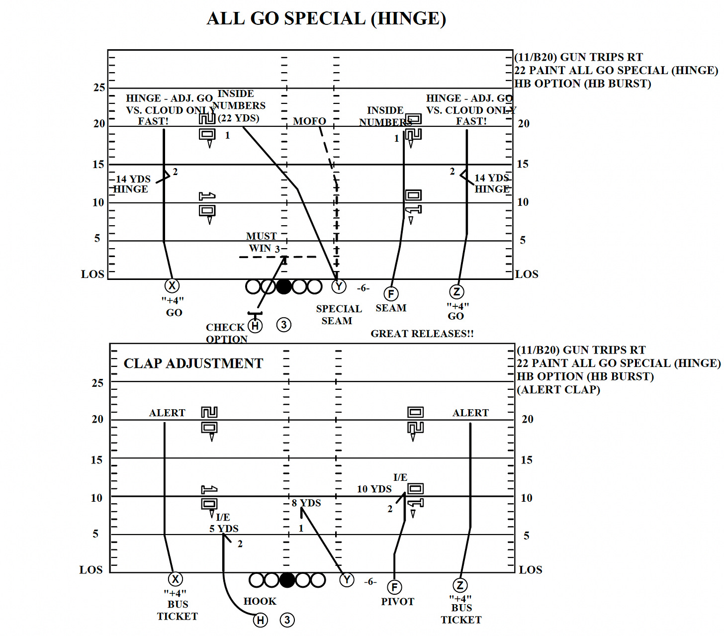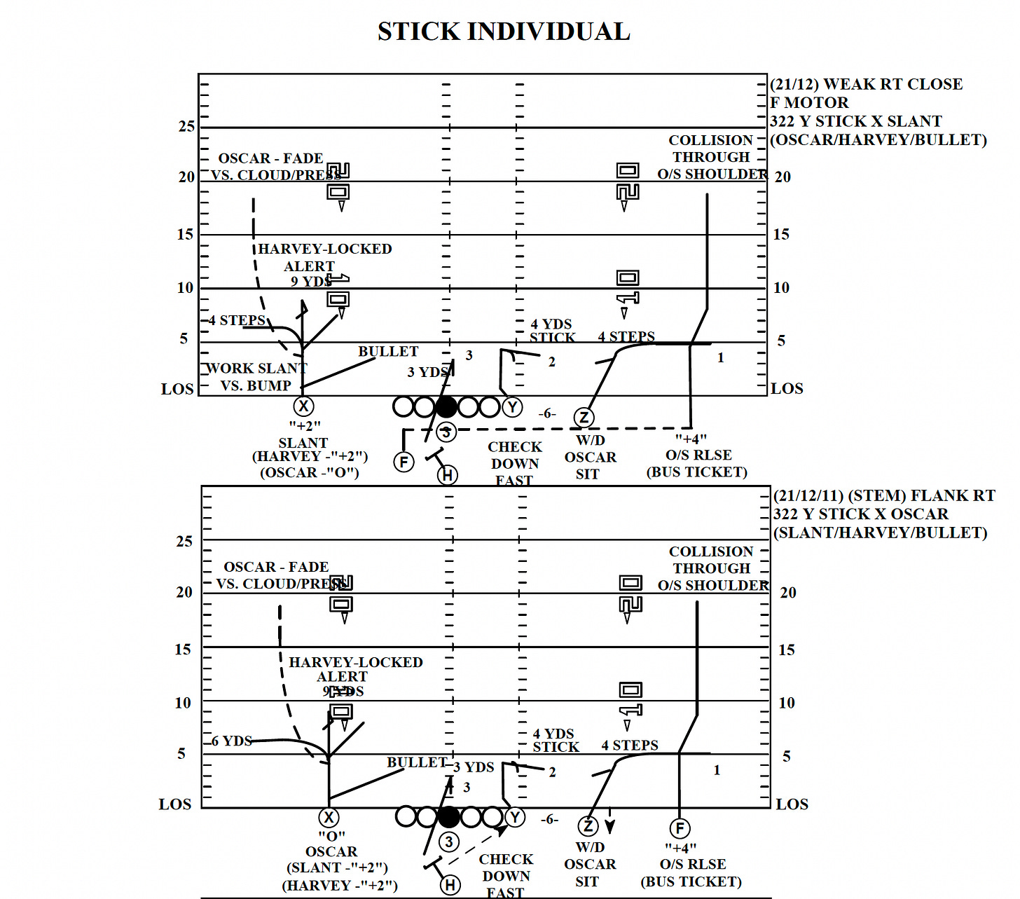 Yet when you zoom out from the intricacies of the protection plan, you get to the base passing game. And for a guy who has roasted the league with some of its greatest ever passing attacks — the thing Payton is famous for — he is as doctrinaire as they come. Everyone has staples, but nobody rattles off the same stuff irrespective of the opponent more than Payton. Before any Broncos game, you can play Payton Bingo: write down the handful of concepts you know he wants to hit, and you can stamp them off before the middle of the second quarter.