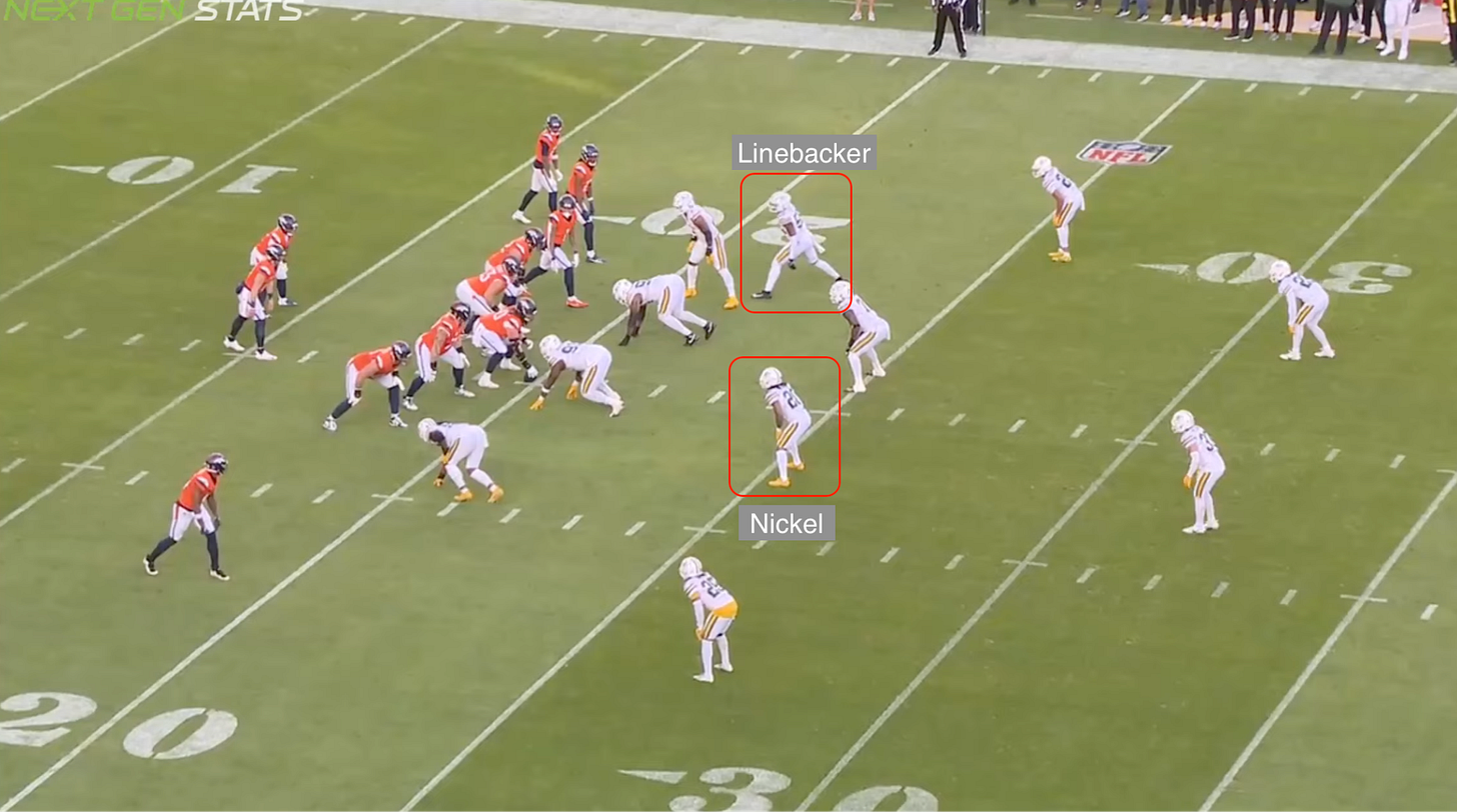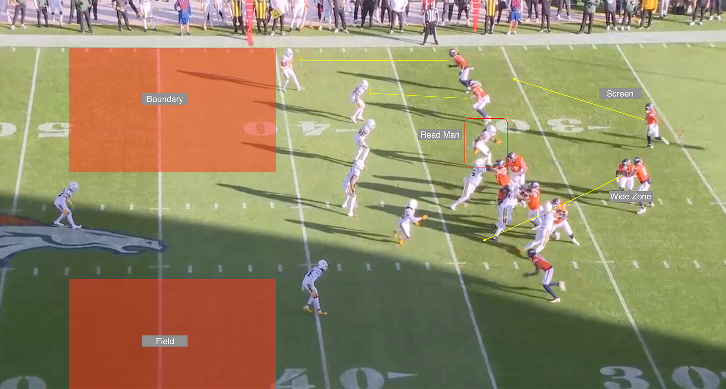 So Payton comes back to it later. It’s the same idea: a wide-zone RPO with an attached screen. Again, the Broncos are looking for easy yards while hunting for information on the nickel corner and the linebacker.
